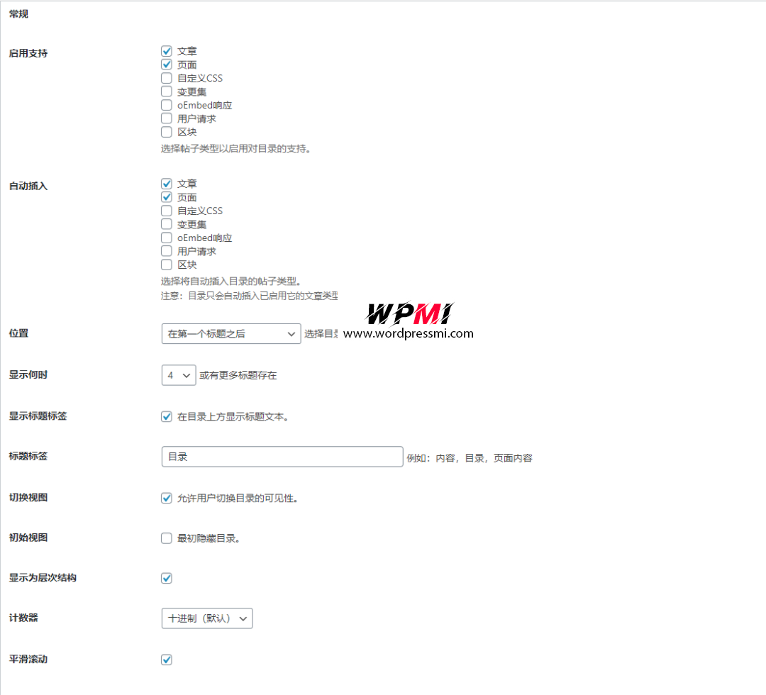 the_content()模板标签一起输出即可。 - (可选)自动将目录插入页面,可以根据启用的文章类型进行选择。