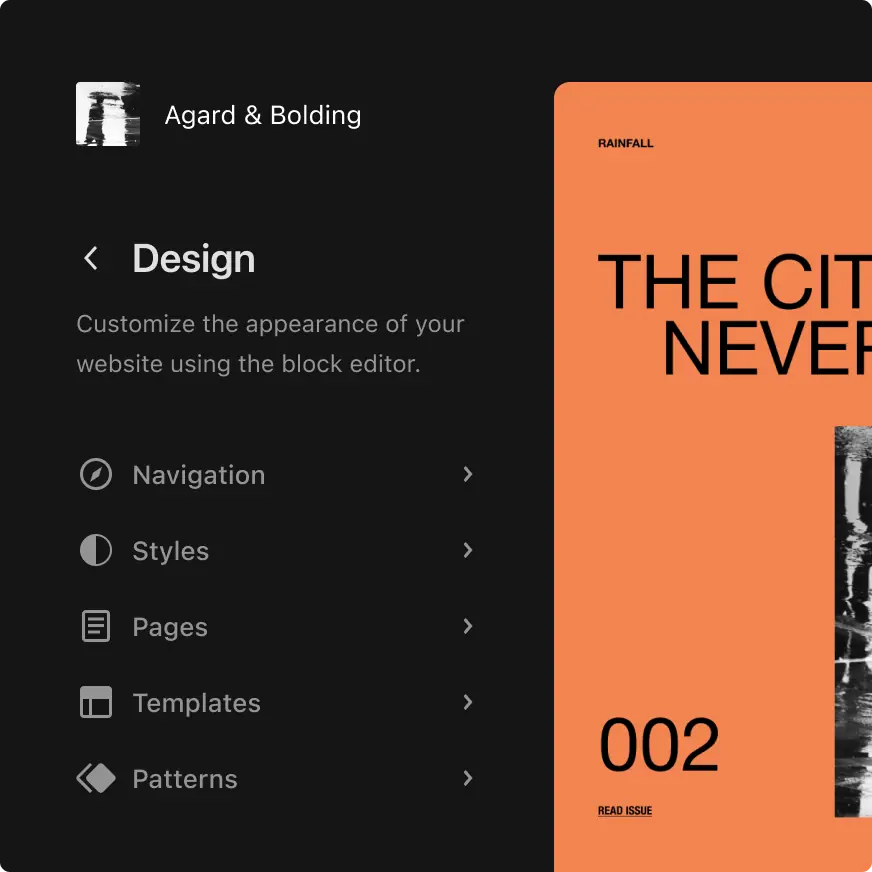 WordPress 6.3 首次将您的内容、模板和模式整合到站点编辑器中。添加页面、浏览样式变化、创建同步模式,并享受对导航菜单的微调控制。不再浪费时间在不同的站点区域之间切换 – 现在您可以专注于最重要的事情。从创作到完成,一切都在一处完成。