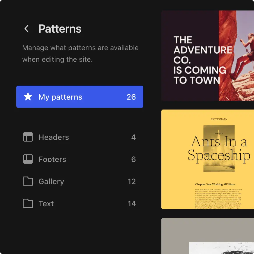 以无限的方式排列块并将它们保存为模式以在整个站点中使用。您甚至可以指定是否同步您的模式(以前称为“可重用块”),以便一项更改适用于站点的所有部分。或者,利用模式作为起点,并能够自定义每个实例。